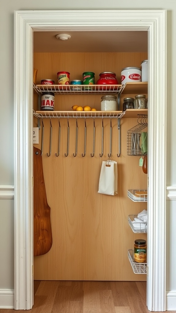 Using racks and hooks can transform any pantry into a functional area. Consider adding a few more hooks for utensils or small baskets for snacks. This simple addition can make a big difference in how you organize your pantry.