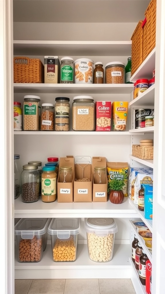 Next, organize your pantry shelves. Use clear bins or labels to categorize items like snacks, canned goods, and baking supplies. This makes finding what you need a breeze. The pantry in the image has a mix of jars and boxes that are easy to see and grab.