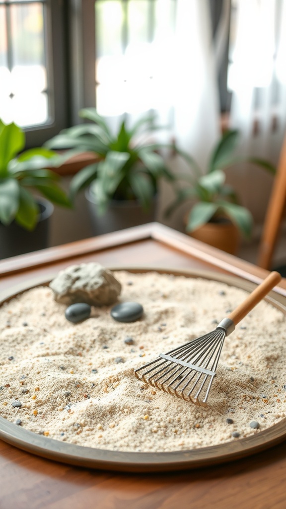 Creating a mini Zen garden at home is a great way to bring a touch of tranquility into your space. Imagine a shallow tray filled with fine sand, perfectly raked to create gentle waves. The image highlights a simple setup with smooth stones and a small rake, elements that are common in Zen gardens.