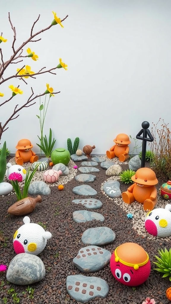 The path, made of smooth stones, invites little feet to explore. Each step can feel like a little adventure. Surrounding the path are cute, whimsical decorations that appeal to children’s imaginations. The bright colors and friendly shapes help make this garden a welcoming spot.