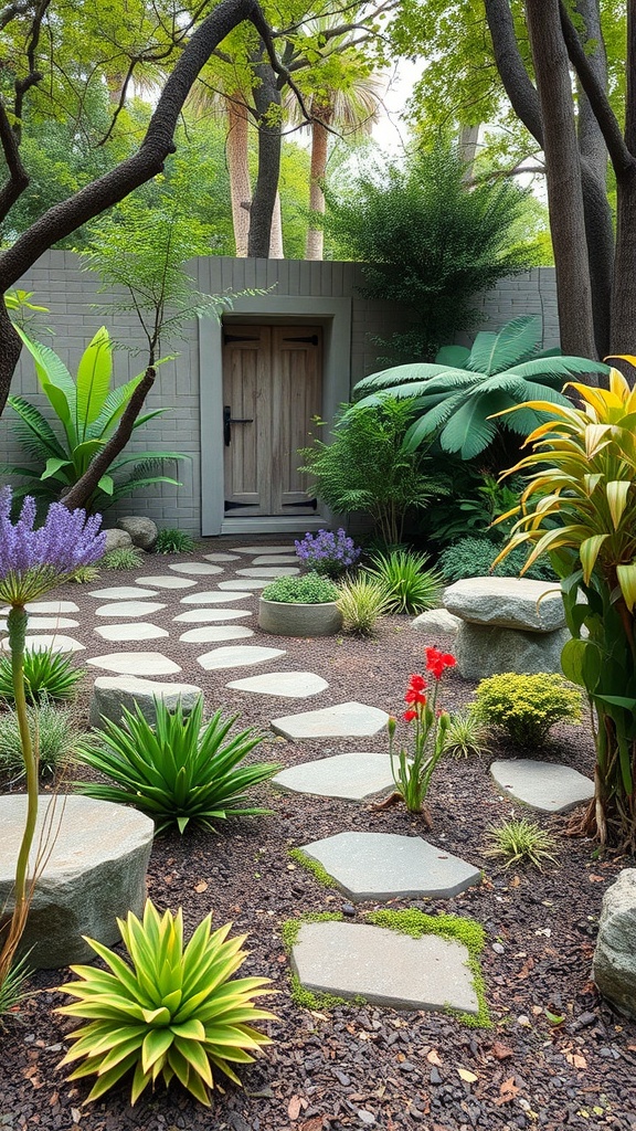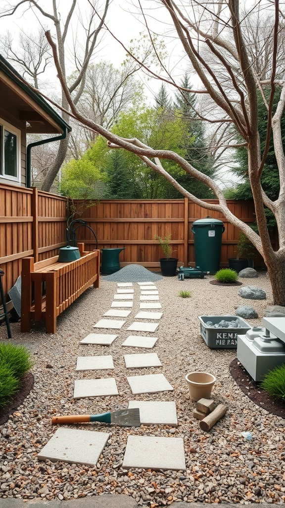 Start by planning your layout. The pathway in the image guides the eye and invites you to explore. Use stones or gravel to create a natural feel. Plants like low grasses and small shrubs can add a touch of greenery without overwhelming the space.