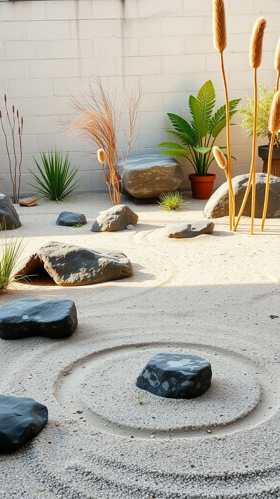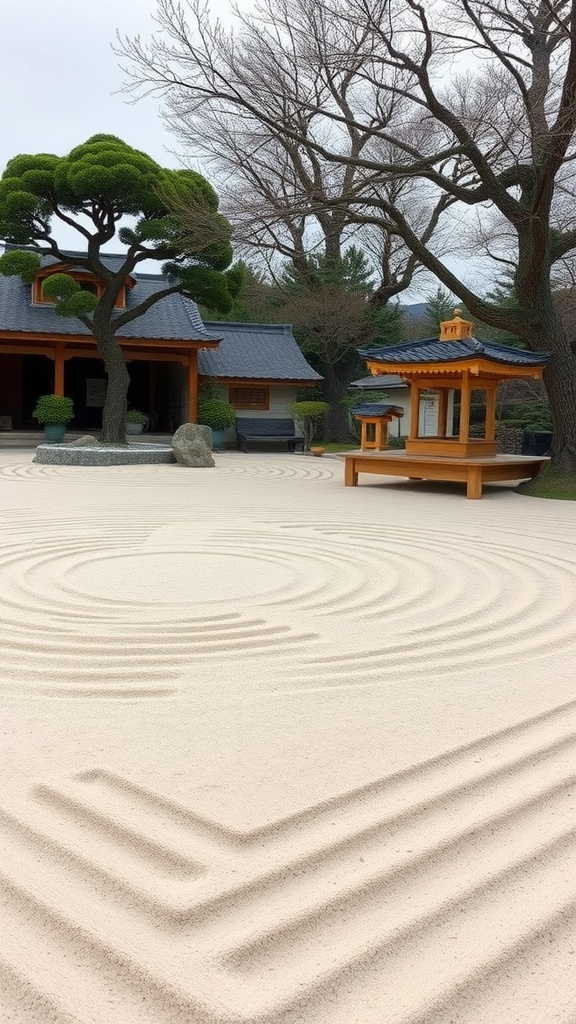 A Zen garden is a delightful space that focuses on simplicity and tranquility. The image shows a serene setup with various elements that come together beautifully. Each aspect has a purpose and adds to the overall feel of the garden.