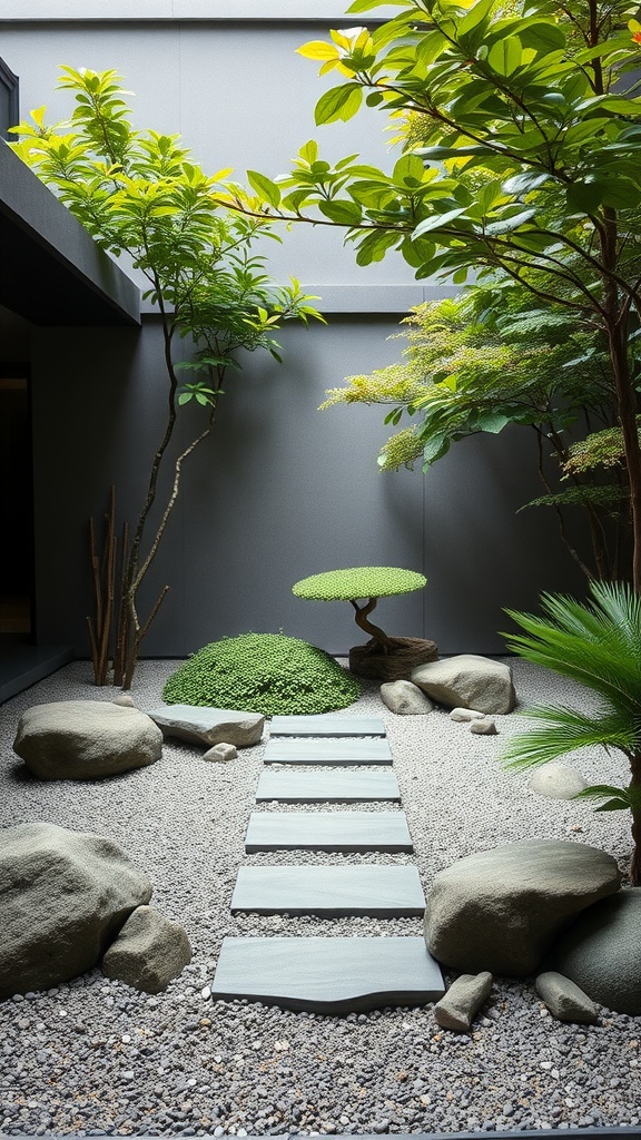 Zen gardens have evolved into a contemporary expression of calm and balance. This image captures a serene space with carefully arranged stones, greenery, and stepping stones that guide the eye and invite contemplation.