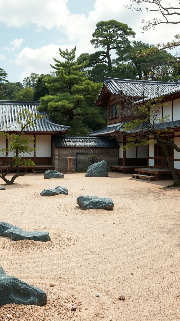 The image above beautifully captures a traditional Zen garden, showcasing smooth sand patterns, carefully placed rocks, and surrounding trees. This layout symbolizes mountains and rivers, encouraging viewers to immerse themselves in nature. Each element is chosen for its significance, creating a tranquil atmosphere.