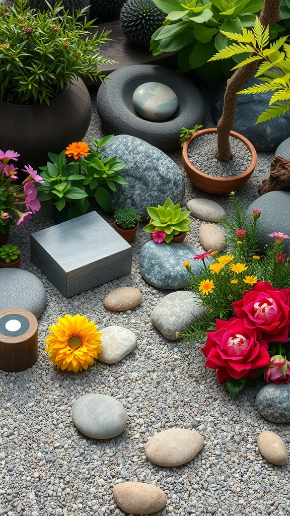 Zen gardens are often known for their simplicity and tranquility. However, introducing color can bring a lively twist to the traditional design. In the image, we see vibrant flowers like sunflowers and roses, beautifully arranged among smooth stones and greenery. This splash of color enhances the overall aesthetic, making the garden more inviting.