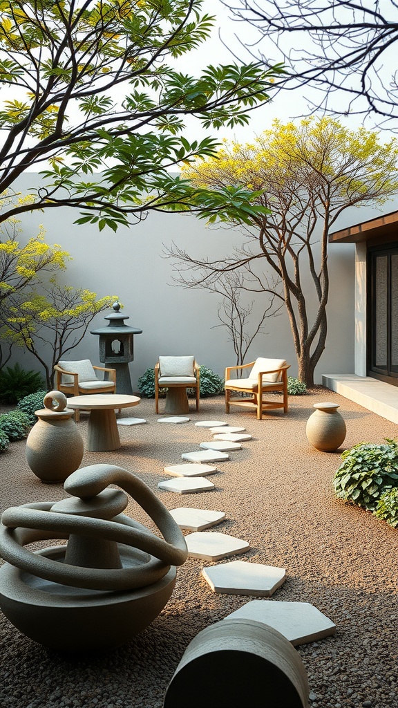 Zen gardens are more than just a place to relax; they’re a canvas where nature and art meet. In the image, we can see a beautifully arranged garden filled with various sculptures. Each piece adds character and invites contemplation, reinforcing the calming essence of the space.