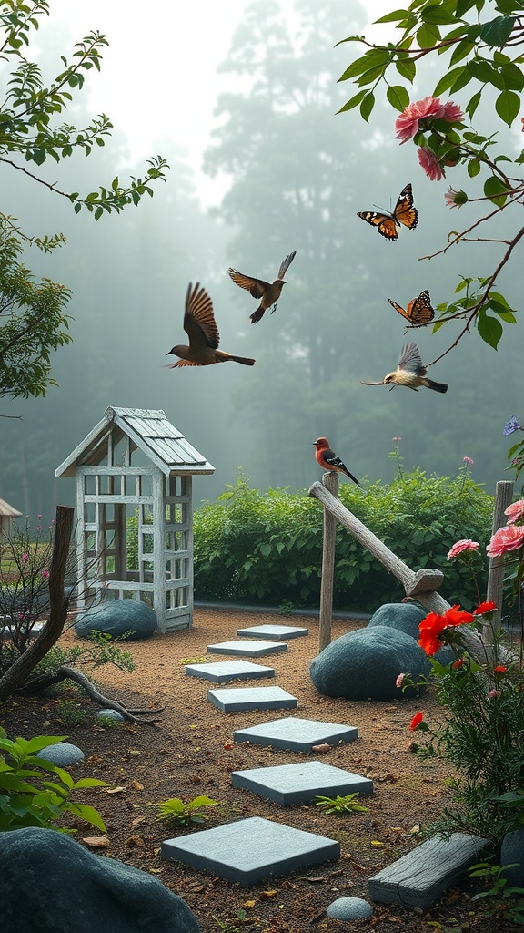 Integrating wildlife into your zen garden can enhance its beauty and make it feel more alive. Consider adding bird feeders or birdhouses, as seen in the image. The variety of birds adds movement and sound, enriching the serene environment.