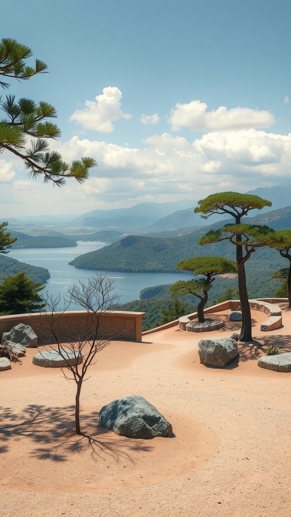 The trees stand tall against a backdrop of mountains and a shimmering lake. This combination reminds us of the balance between nature and tranquility. The carefully placed rocks invite visitors to stop and reflect, while the gentle curves in the sand evoke calming waves.