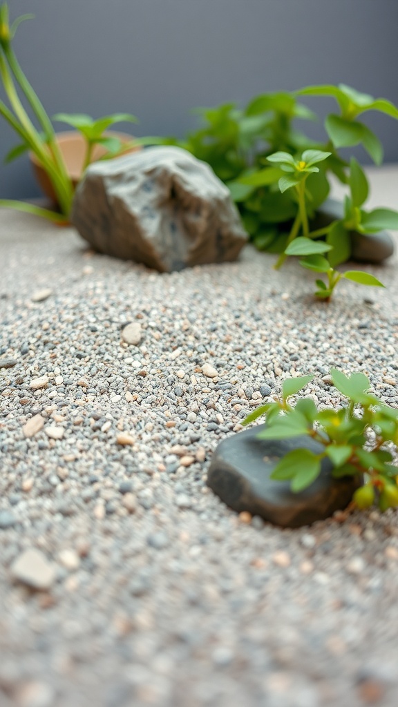 Plants are an essential component as well. They bring life and color, contrasting beautifully with the neutral tones of the gravel and stones. Here, you can see vibrant green leaves peeking through, highlighting nature’s simplicity.
