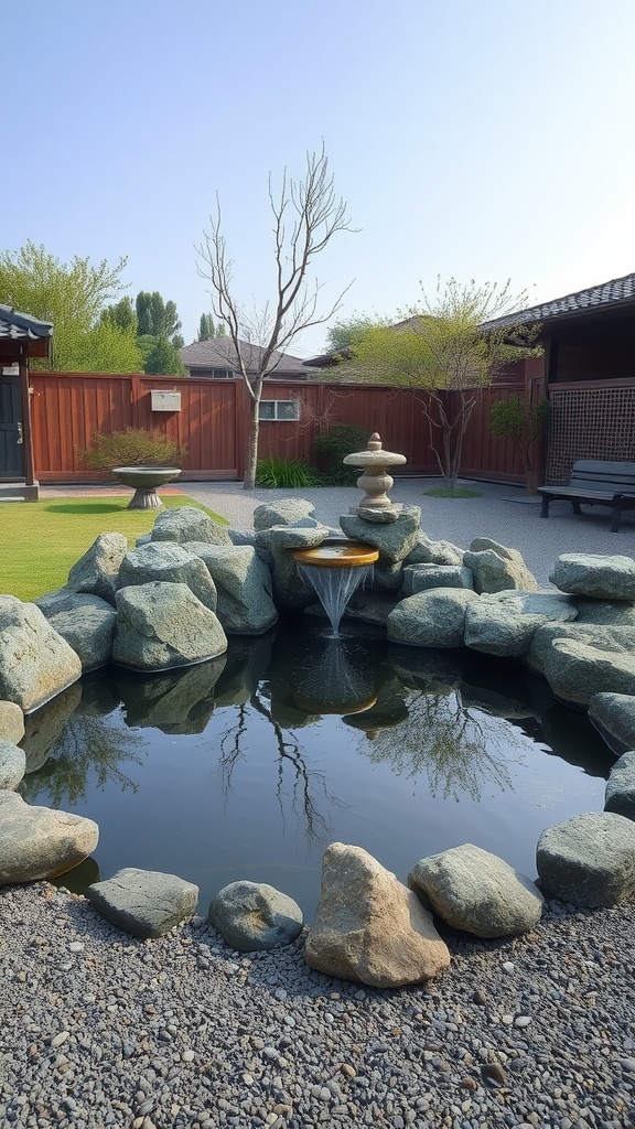 Water features are a key component of any zen garden, adding both beauty and tranquility. In the image, we see a serene pond surrounded by carefully placed rocks. The gentle flow of water from the fountain creates a soothing sound that enhances the peaceful atmosphere.