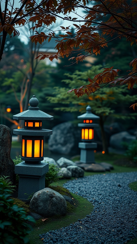 In the image, you can see traditional stone lanterns glowing softly. The warm light highlights their intricate designs, adding character to the garden. This gentle lighting invites visitors to slow down and appreciate the surroundings.